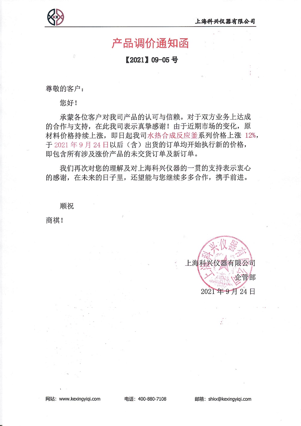 承蒙各位客戶對我司產品的認可與信賴。對于雙方業務上達成的合作與支持,在此我司表示真摯感謝!由于近期市場的變化,原材料價格持續上漲,即日起我司水熱合成反應釜系列價格上漲 12%,2021 年 9 月 24 日以后(含)出貨的訂單均開始執行新的價格,既包含所有涉及漲價產品的未交貨訂單及新訂單。
